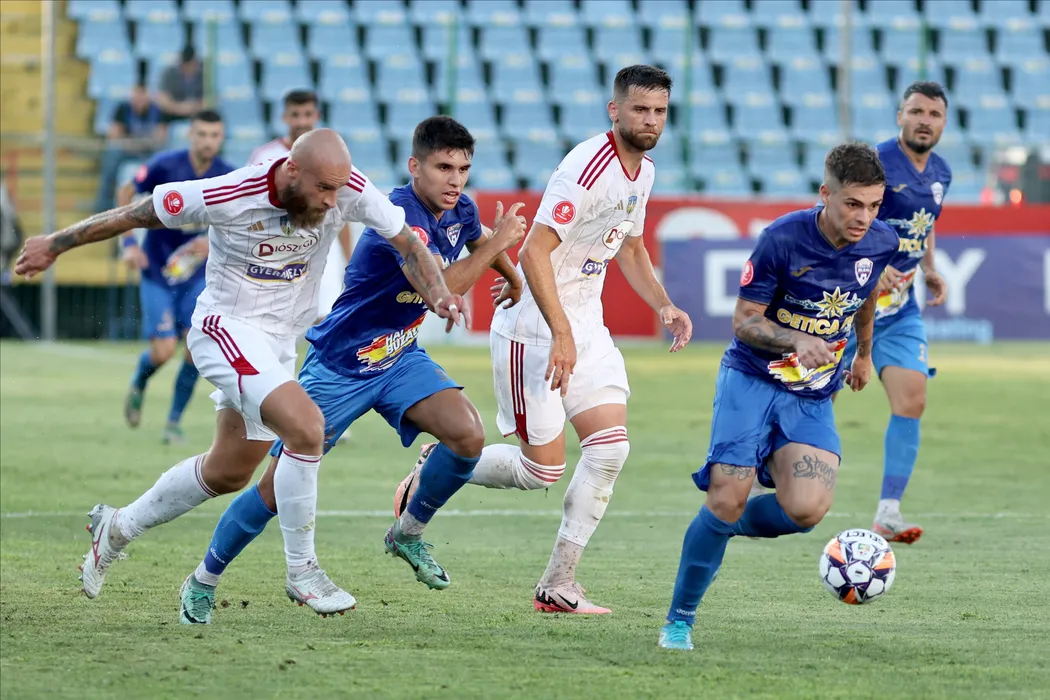 Cristian Cosmin Dumitru, Robert Ionuț Sălceanu și Branislav Ninaj, Isnik Alimi în meciul de fotbal dintre Gloria Buzău și Sepsi OSK Sfantu Gheorghe, contând pentru SuperLiga Superbet, desfășurat pe Stadionul Gloria din Buzău, luni 22 iulie 2024. © FOTO: Gică FLUȘTER /SPORT PICTURES