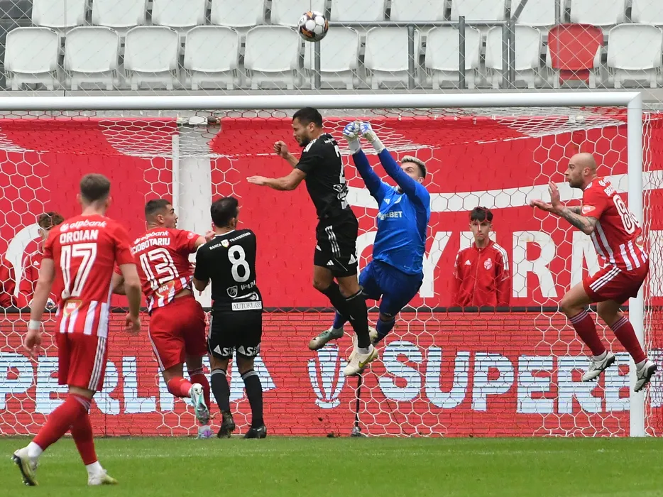 Andrei Cristian Gorcea, Kelven Da Silva Thalisson și Branislav Ninaj în meciul de fotbal dintre Sepsi OSK Sfântu Gheorghe și FC Universitatea Cluj contând pentru SuperLiga Superbet, desfășurat pe Stadionul SEPSI Arena OSK din Sfântu Gheorghe, duminică 25 februarie 2024. © FOTO: Bogdan BALAS/SPORT PICTURES