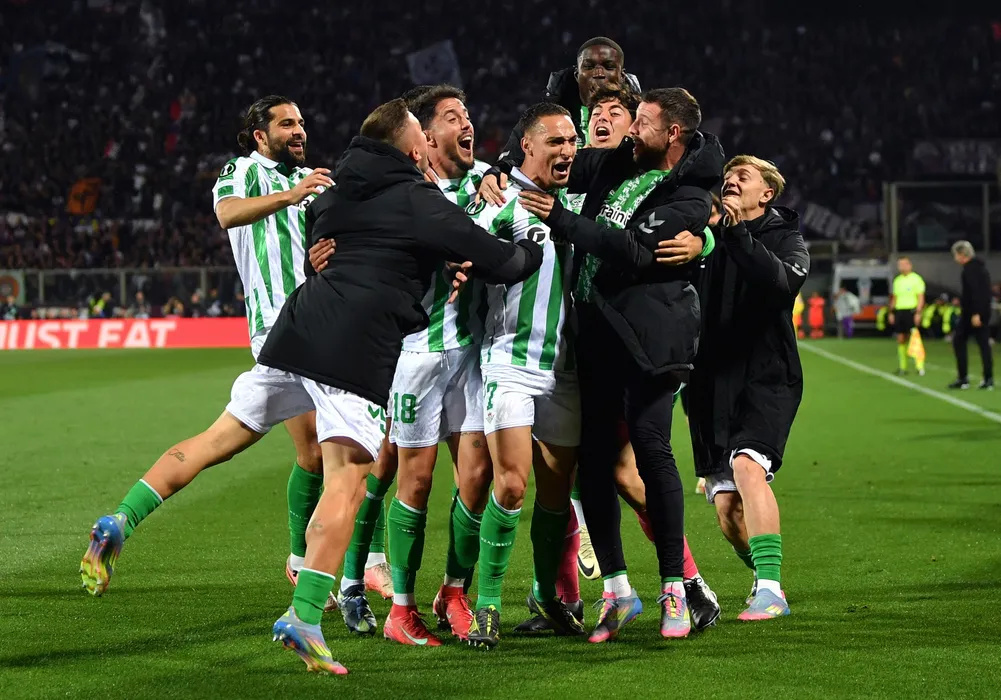 FLORENCE, ITALY - MAY 08: Antony of Real Betis celebrates scoring his team's first goal with teammates during the UEFA Conference League 2024/25 Semi Final First Leg match between ACF Fiorentina and Real Betis Balompie at Artemio Franchi on May 08, 2025 in Florence, Italy. (Photo by Valerio Pennicino - UEFA/UEFA via Getty Images)