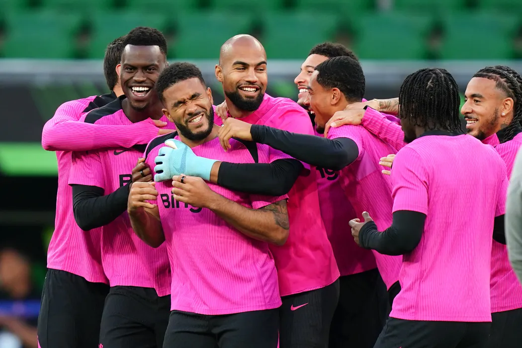 27 May 2025, Poland, Wroclaw: Chelsea's Reece James (3rd L) is surrounded by team-mates during a training session at the Wroclaw Stadium, ahead of Wednesday's UEFA Europa Conference League final soccer match against Real Betis. Photo: Jane Barlow/PA Wire/dpa