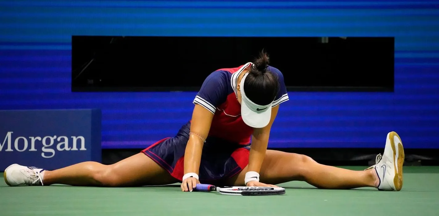 Sep 6, 2021; Flushing, NY, USA; Bianca Andreescu of Canada falls after a shot to Maria Sakkari of Greece on day eight of the 2021 U.S. Open tennis tournament at USTA Billie Jean King National Tennis Center.,Image: 630753323, License: Rights-managed, Restrictions: *** World Rights ***, Model Release: no, Credit line: Profimedia