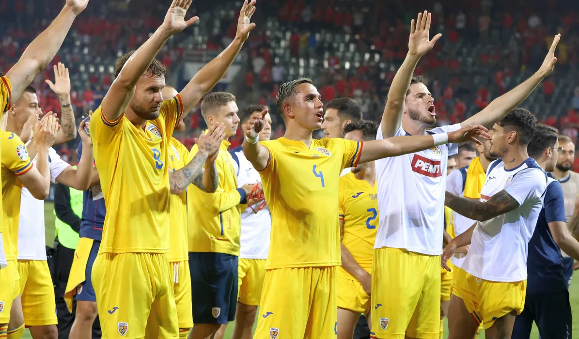 Fotbalistii romani George Puşcaş, Cristian Manea,Tudor Băluţă si Florinel Coman saluta galeria dupa meciul de fotbal dintre Elvetia si Romania, contand pentru Preliminariile Campionatului European, desfasurat pe Luzern Arena din Lucerna, luni 19 iunie 2023.© FOTO SPORT PICTURES