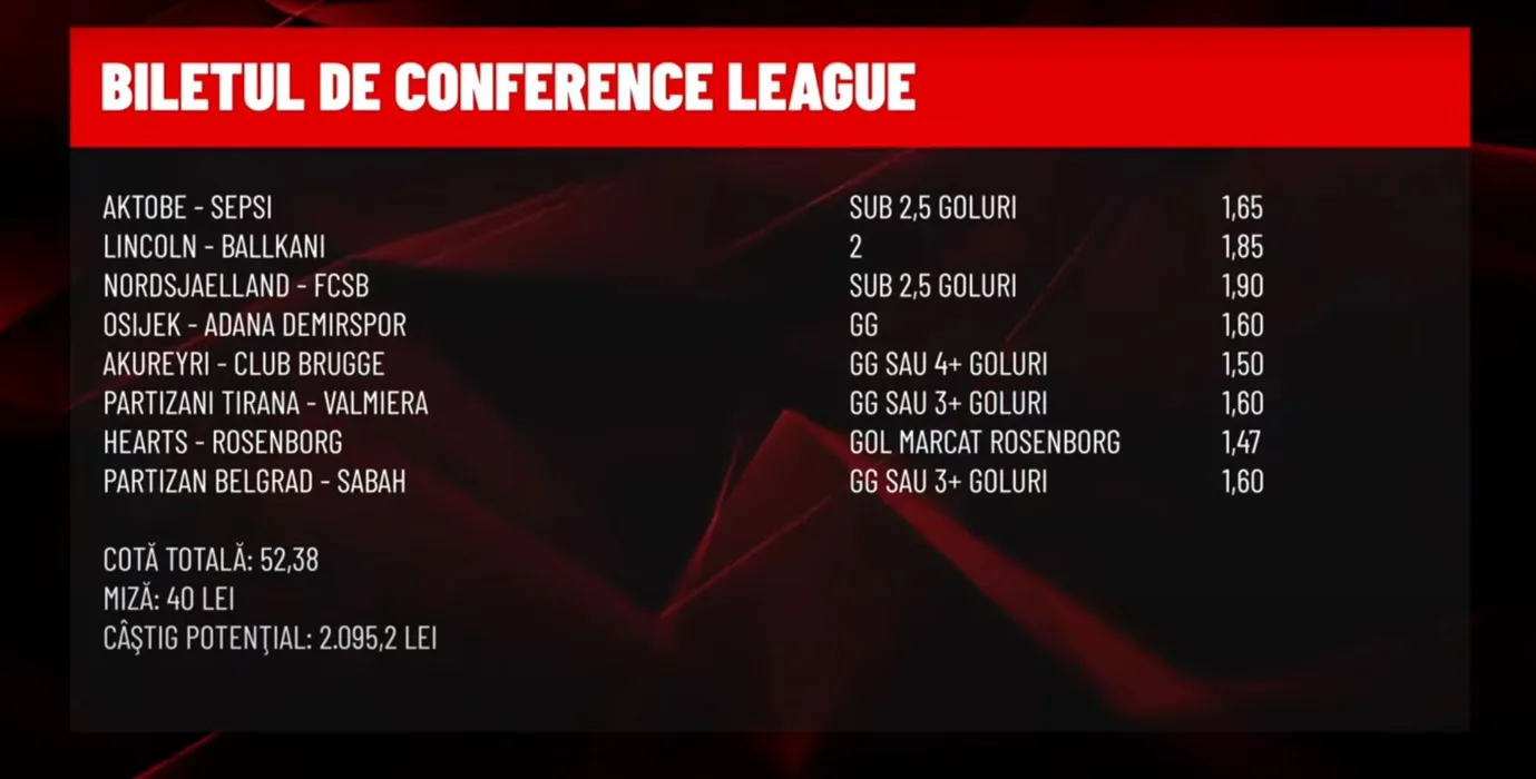Biletul de Conference League, prezentat de Daniel Nazare: 8 evenimente pentru o cotă de 52! Pe ce a mizat la Aktobe – Sepsi și Nordsjaelland – FCSB | VIDEO PARIOLOGIA