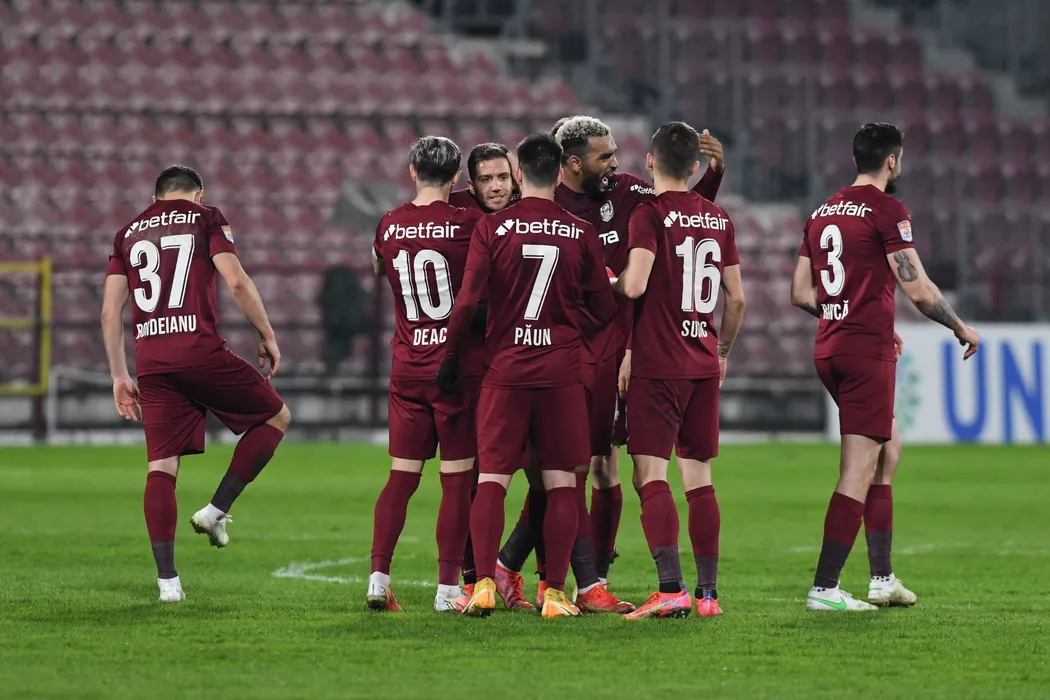 Jucatorii formatiei CFR Cluj reactioneaza dupa ce au inscris un gol in timpul meciului de fotbal contra echipei CSM Politehnica Iasi din etapa a XXVII-a a Ligii 1, disputat pe stadionul Dr. Constantin Radulescu din Cluj-Napoca, duminica, 14 martie 2021 FLAVIU BUBOI / MEDIAFAX FOTO