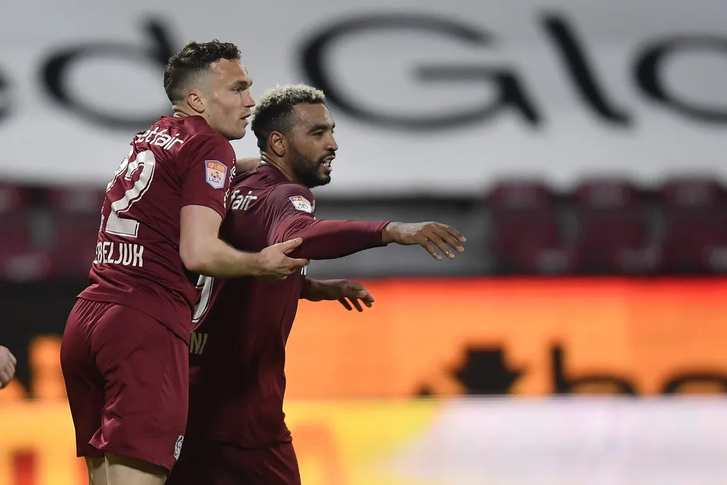 Billel Omrani (D), de la CFR Cluj, reactioneaza dupa ce a inscris un gol in timpul meciului de fotbal contra echipei Dinamo din etapa 29 a Ligii 1, disputat pe stadionul Dr. Constantin Radulescu din Cluj-Napoca, luni, 5 aprilie 2021.ALEX NICODIM / MEDIAFAX FOTO