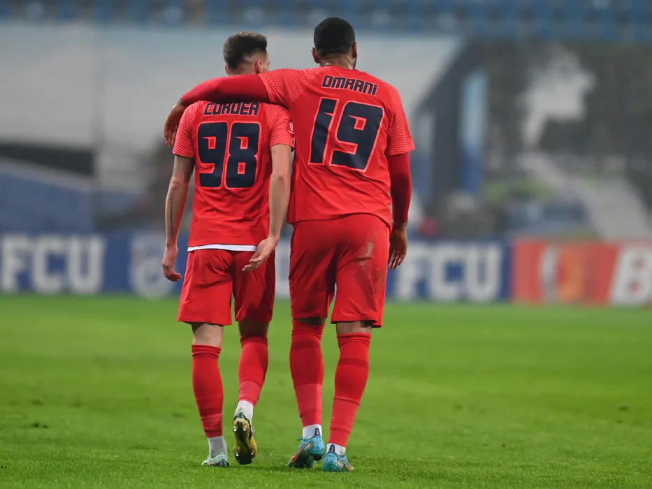 Bucurie a fotbalistilor stelisti dupa un gol marcat cu Andrei Ioan Cordea si Abdel Slem Billel Omrani in meciul de fotbal dintre FC U Craiova si FCSB, contand pentru Superliga Superbet, desfasurat pe Stadionul Ion Oblemenco din Craiova, duminica 13 noiembrie 2022. © FOTO:Razvan Pasarica/SPORT PICTURES
