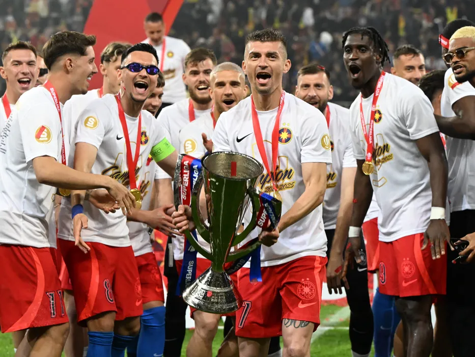 Fotbalistii ros-albastrii celebreaza alături de Florin Lucian Tănase castigarea Superligii Superbet in urma meciului dintre FCSB si Universitatea Craiova, din cadrul Play off-ului competitiei, desfasurat pe Arena Nationala din Bucuresti, sambata 17 mai 2025. © FOTO:Razvan Pasarica/SPORT PICTURES