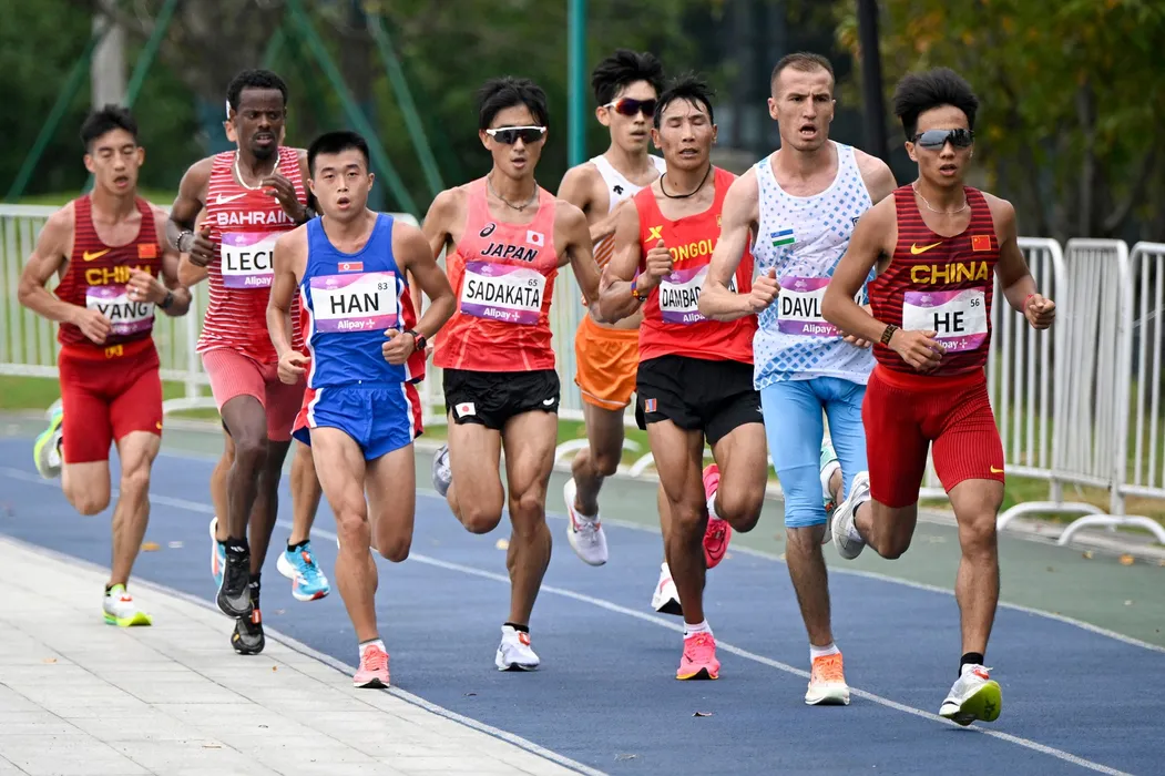 China's He Jie (R) competes in the men's marathon final athletics event during the 2022 Asian Games in Hangzhou in China's eastern Zhejiang province on October 5, 2023.,Image: 811022414, License: Rights-managed, Restrictions: , Model Release: no