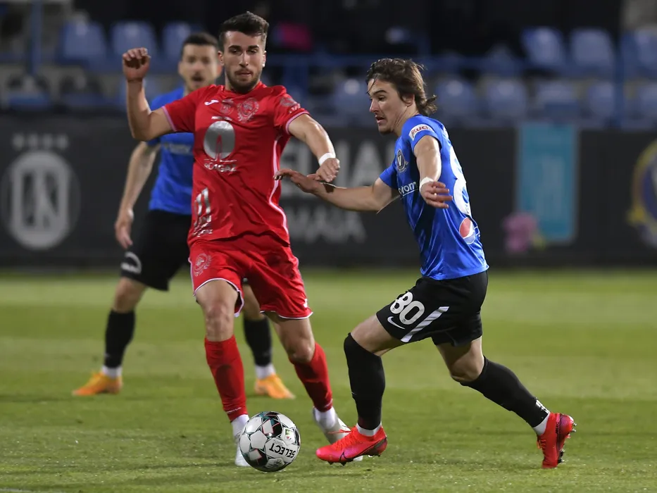 Octavian Ronaldo Andrei Deaconu si Alexi Paul Pitu in meciul de fotbal dintre FC Viitorul Constanta si Gaz Metan Medias, din cadrul Ligii 1 Casa Pariurilor, desfasurat fara spectatori pe Stadionul Central al Academiei Gheorghe Hagi din Ovidiu, luni 12 aprilie 2021. © FOTO:Razvan Pasarica/SPORT PICTURES