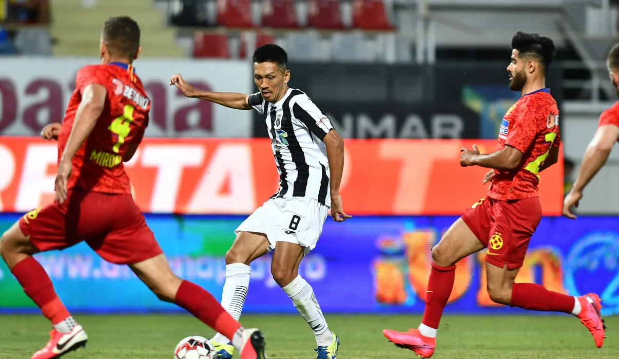 Seto Takayuki marcheaza un gol de langa Ionut Vina si George Andrei Miron in meciul de fotbal dintre Astra Giurgiu si FCSB, contand pentru play-off-ul Ligii 1 Casa Pariurilor, disputat fara spectatori pe Stadionul Marin Anastasovici din Giurgiu, luni 29 iunie 2020. © FOTO:Razvan Pasarica/SPORT PICTURES