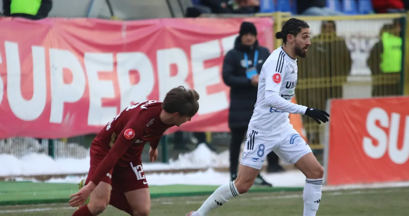 Eduard Marian Florescu și Petar Mamic în meciul de fotbal dintre AFC Botoșani și FC CFR 1907 Cluj SA, contând pentru SUPERLIGA SUPERBET, desfășurat pe Stadionul Municipal din Botoșani, duminică 21 ianuarie 2024. © FOTO: Ionuț TABULTOC/SPORT PICTURES