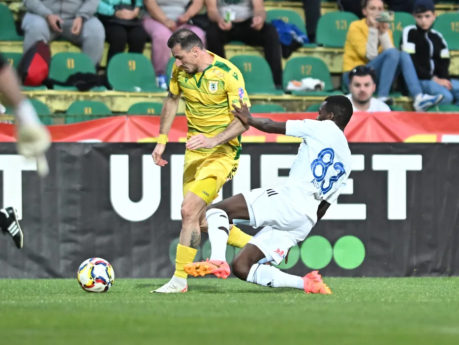 Stefan Blanaru si Aldair Caputa Ferreira in meciul de fotbal dintre CS Mioveni si FC Botosani, barajul retur pentru mentinere/retrogradare in Superliga Superbet, desfasurat pe Stadionul Orasenesc din Mioveni, vineri 24 mai 2024. © FOTO:Razvan Pasarica/SPORT PICTURES