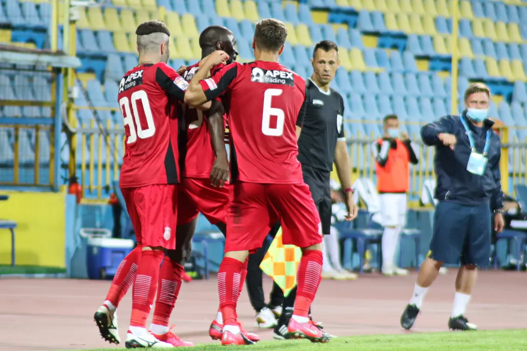 Jucatorii echipei AFC Astra reactioneaza dupa inscrierea unui gol in meciul de fotbal dintre Gaz Metan Medias si AFC Astra Giurgiu din etapa 8 a play-off-ului Ligii 1 Casa Pariurilor, disputat pe stadionul Gaz Metan din Medias, vineri, 17 iulie 2020.© FOTO:Valentin Macrea/Sport Pictures