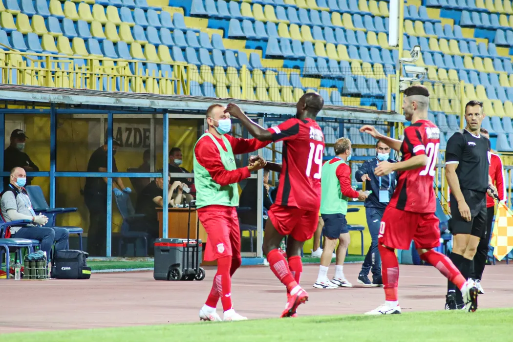 Jucatorii echipei AFC Astra reactioneaza dupa inscrierea unui gol in meciul de fotbal dintre Gaz Metan Medias si AFC Astra Giurgiu din etapa 8 a play-off-ului Ligii 1 Casa Pariurilor, disputat pe stadionul Gaz Metan din Medias, vineri, 17 iulie 2020.© FOTO:Valentin Macrea/Sport Pictures