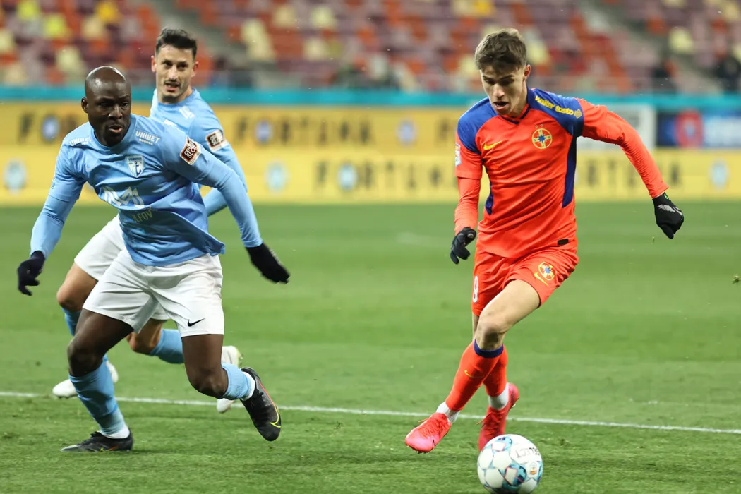 Ulrich Meleke (S), de la FC Voluntari, lupta pentru balon cu Octavian Popescu (D), de la FCSB, in meciul de fotbal din etapa 30 a Ligii 1, disputat pe Arena Nationala din Bucuresti, duminica, 6 martie 2022. GEORGE FILIP / MEDIAFAX FOTO