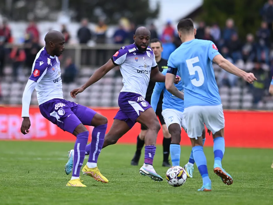 Kevin Brandon Xavier Koubemba si Paul Arnold Garita in meciul de fotbal dintre FC Arges si FC Voluntari, contand pentru Play-out-ul Superligii Superbet, desfasurat pe Stadionul Nicolae Dobrin din Pitesti, duminica 2 aprilie 2023. © FOTO:Razvan Pasarica/SPORT PICTURES