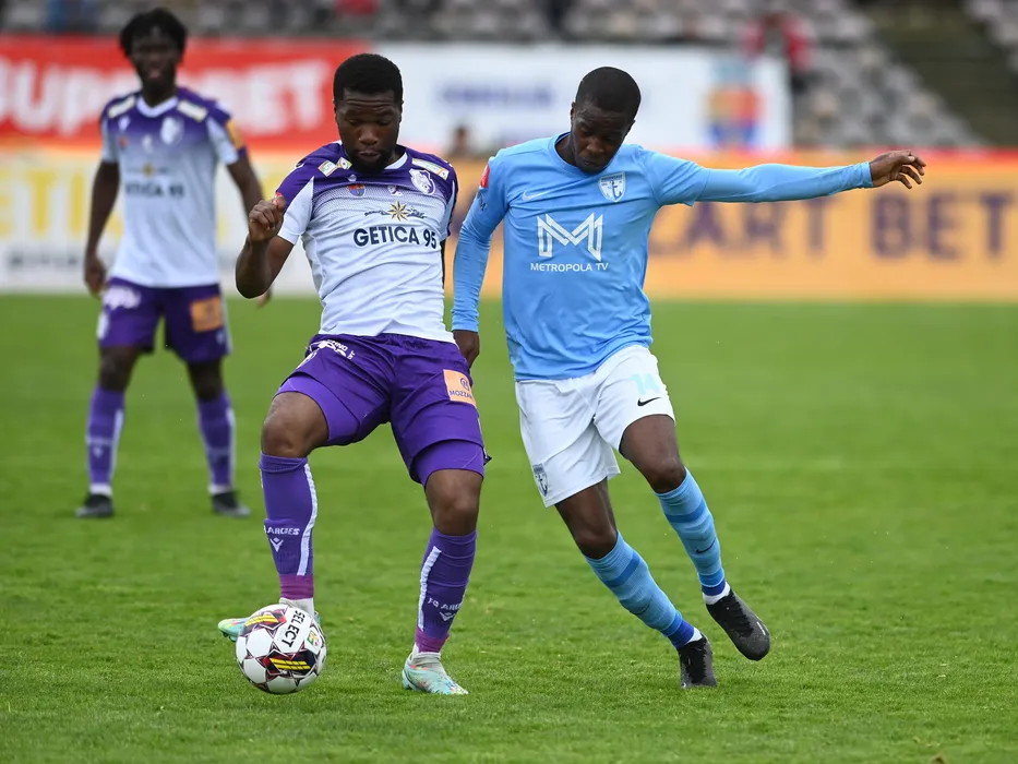 Tony Wilfried Nyandjou Njike si Marcelo Andre Da Veiga Lopes in meciul de fotbal dintre FC Arges si FC Voluntari, contand pentru Play-out-ul Superligii Superbet, desfasurat pe Stadionul Nicolae Dobrin din Pitesti, duminica 2 aprilie 2023. © FOTO:Razvan Pasarica/SPORT PICTURES