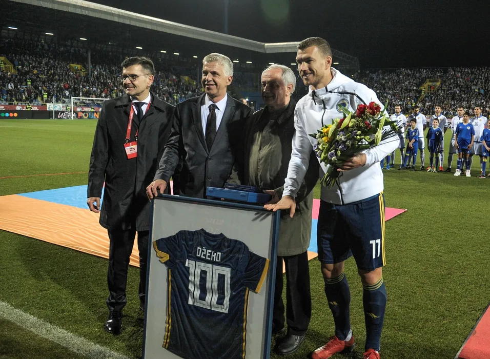 SARAJEVO, BOSNIA AND HERZEGOVINA - MARCH 23 : Edin Dzeko (11) of Bosnia and Herzegovina poses for a photo after he received '100' numbered jersey as a present as part of his 100th national match in his career prior to the UEFA Euro 2020 Group J qualifying match between Bosnia and Herzegovina and Armenia at Grbavica Stadium in Sarajevo, Bosnia and Herzegovina on March 23, 2019. Samir Yordamovic / Anadolu Agency/ABACAPRESS.COM