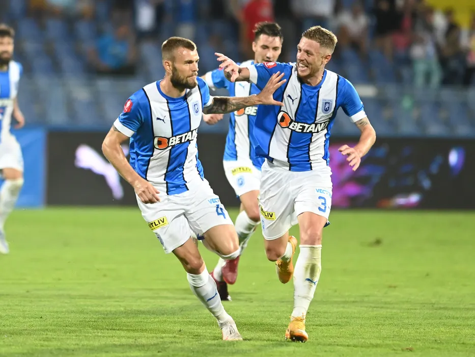 Alexandru Cretu se bucura dupa un gol marcat alaturi de Bogdan Alexandru Mitrea in meciul de fotbal dintre Universitatea Craiova si FC Botosani, contand pentru Superliga Superbet, desfasurat pe Stadionul Municipal din Drobeta Turnu Severin, luni 29 august 2022. © FOTO:Razvan Pasarica/SPORT PICTURES