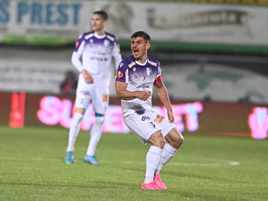 Andrias Cristian Calcan se bucura dupa un gol marcat in meciul de fotbal dintre FC Arges si Dinamo Bucuresti, contand pentru mansa retur a Barajului pentru mentinerea in Superliga Superbet, desfasurat pe Stadionul Orasenesc din Mioveni, sambata 3 iunie 2023. © FOTO:Razvan Pasarica/SPORT PICTURES