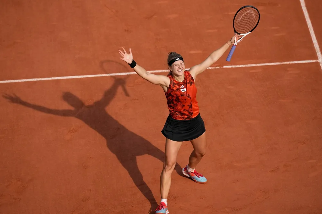 Karolina Muchova of the Czech Republic celebrates winning her semifinal match of the French Open tennis tournament against Aryna Sabalenka of Belarus in three sets, 7-6 (7-5), 6-7 (5-7), 7-5, at the Roland Garros stadium in Paris, Thursday, June 8, 2023.,Image: 782246676, License: Rights-managed, Restrictions: This content is intended for editorial use only. For other uses, additional clearances may be required., Model Release: no, Pictured: Aryna Sabalenka,Karolina Muchova