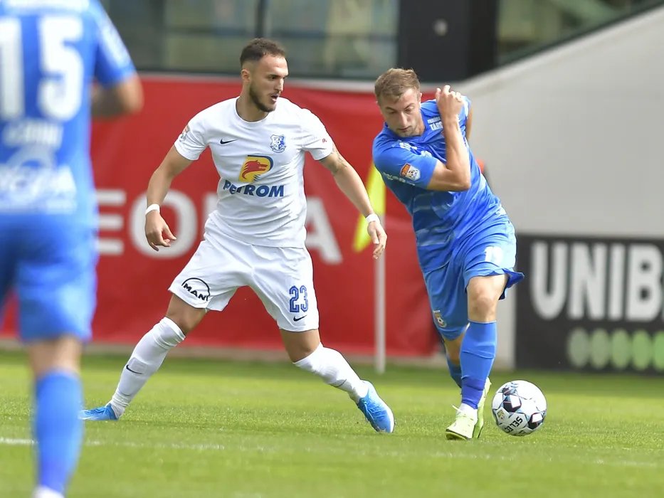 Damien Dylan Dussaut si Iliuta Daniel Popa in meciul de fotbal dintre Chindia Targoviste si Farul Constanta, contand pentru Liga 1 Casa Pariurilor, desfasurat pe Stadionul Ilie Oana din Ploiesti, sambata 18 septembrie 2021. © FOTO:Razvan Pasarica/SPORT PICTURES