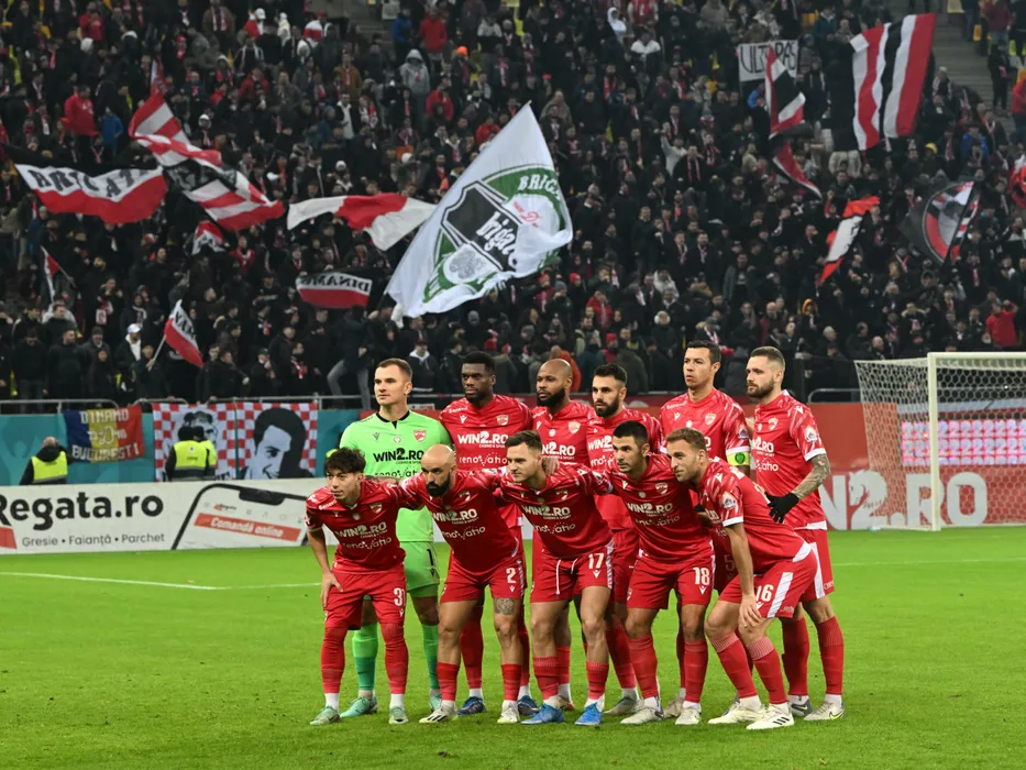 Fotbaliștii dinamoviști la o fotografie de grup alături de galerie realizată înaintea meciului de fotbal dintre Dinamo Bucuresti si Rapid Bucuresti, contând pentru Superliga Superbet, desfășurat pe Arena Nationala din Bucuresti, sambata 27 ianuarie 2024. © FOTO: Răzvan PĂSĂRICĂ/SPORT PICTURES