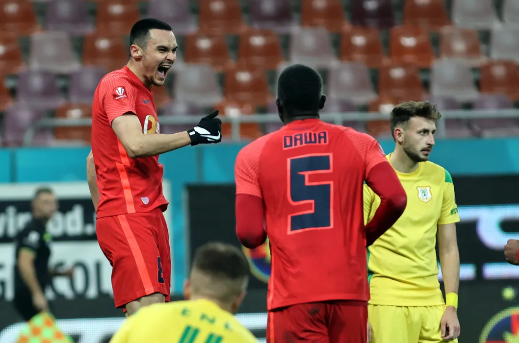 Adrian Sut (S), de la FCSB, reactioneaza dupa ce a inscris un gol in timpul meciului de fotbal contra echipei CS Mioveni din etapa a XIX-a a Superligii, disputat pe Arena Nationala din Bucuresti, luni, 5 decembrie 2022. GEORGE FILIP / MEDIAFAX FOTO