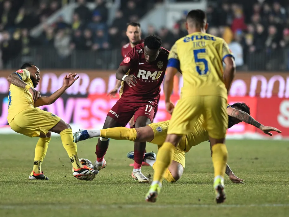 Mihai Alexandru Roman si Philip Porwei Otele în meciul de fotbal dintre Petrolul Ploiesti si CFR Cluj, contând pentru Superliga Superbet, desfășurat pe Stadionul Ilie Oana din Ploiesti, sambata 3 februarie 2024. © FOTO: Răzvan PĂSĂRICĂ/SPORT PICTURES