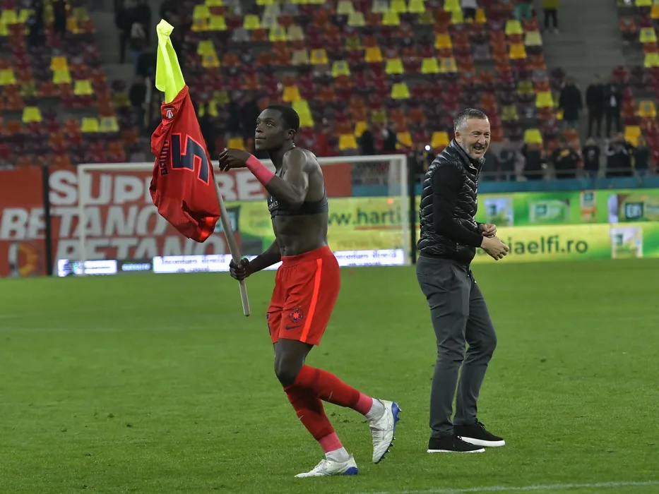 Mihai Stoica se bucura alaturi de Joyskim Aurelien Dawa Tchakonte dupa meciul de fotbal dintre FCSB si CFR Cluj, contand pentru Play-off-ul Superligii Superbet, desfasurat pe Arena Nationala din Bucuresti, duminica 14 mai 2023. © FOTO:Razvan Pasarica/SPORT PICTURES