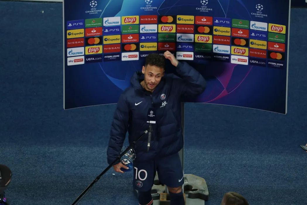 PARIS, FRANCE - APRIL 13: Neymar Jr of Paris Saint-Germain poses with his trophy of best player of the games after the UEFA Champions League Quarter Final Second Leg match between Paris Saint-Germain and FC Bayern Munich at Parc des Princes on April 13, 2021 in Paris, France. (Photo by Xavier Laine/Getty Images)