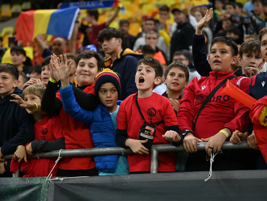 Tinerii suporteri romani isi incurajeaza favoritii in meciul de fotbal dintre Romania si Andorra, din cadrul preliminariilor Campionatului European 2024, desfasurat pe Arena Nationala, duminica 15 octombrie 2023. © FOTO:Razvan Pasarica/SPORT PICTURES