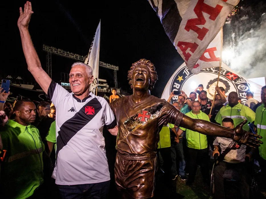 This handout picture released by Brazilian football team Vasco da Gama shows late Brazilian football player Roberto Dinamite reacting during the inauguration of his statue at the Sao January stadium in Rio de Janeiro, Brazil, on April 28, 2022. Brazilian footballer Roberto Dinamite, top scorer in the history of the Brazilian championship, died on Sunday January 8, 2023 at the age of 68, following bowel cancer, announced the club of Vasco da Gama, in which he was the absolute idol.,Image: 748398592, License: Rights-managed, Restrictions: RESTRICTED TO EDITORIAL USE - MANDATORY CREDIT "AFP PHOTO / VASCO DA GAMA / DANIEL RAMALHO" - NO MARKETING NO ADVERTISING CAMPAIGNS - DISTRIBUTED AS A SERVICE TO CLIENTS, ***