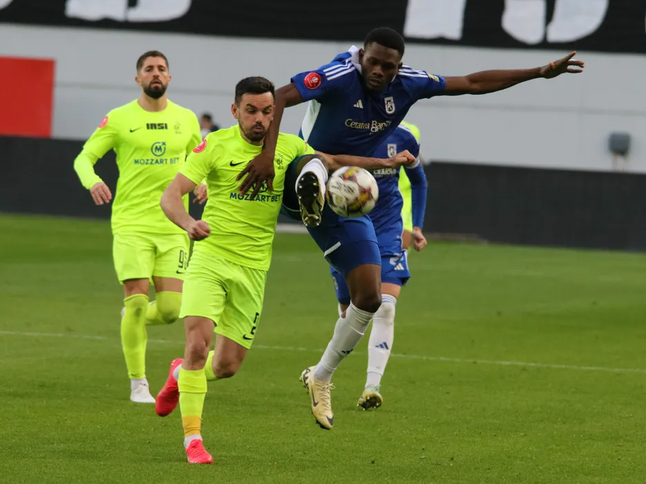 Jibril Ibrahim și Marius Mădălin Martac în meciul de fotbal dintre FCU 1948 Craiova și Poli Iași, contând pentru Superliga Superbet, desfășurat pe Stadionul Ion Oblemenco din Craiova, marți 27 februarie 2024. © FOTO: Cătălin CIUPUREANU/SPORT PICTURES