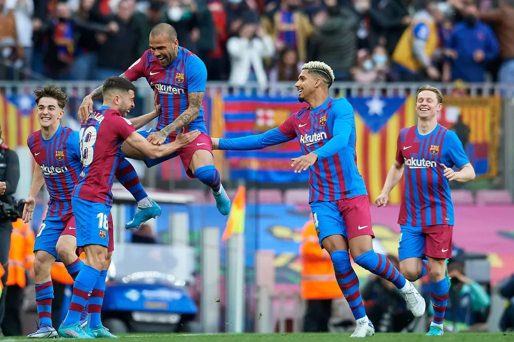 Dani Alves of Barcelona celebrates after scoring his sides first goal during the LaLiga Santander match between FC Barcelona and Club Atletico de Madrid at Camp Nou on February 6, 2022 in Barcelona, Spain.