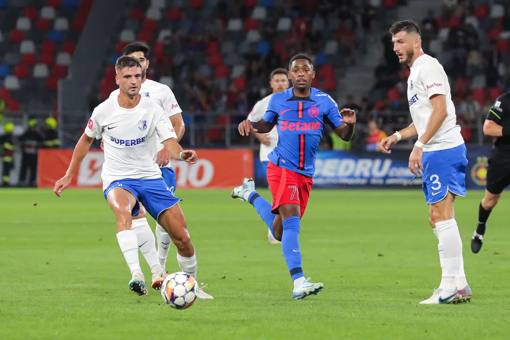 Ionuț Daniel Vână, Mihai Popescu și Luis Phelipe De Souza Figueiredo în meciul de fotbal dintre FCSB și Farul Constanța, contând pentru Superliga Superbet, desfășurat pe Stadionul Steaua din București, vineri 9 august 2024. © FOTO: Antonio VASILE/SPORT PICTURES