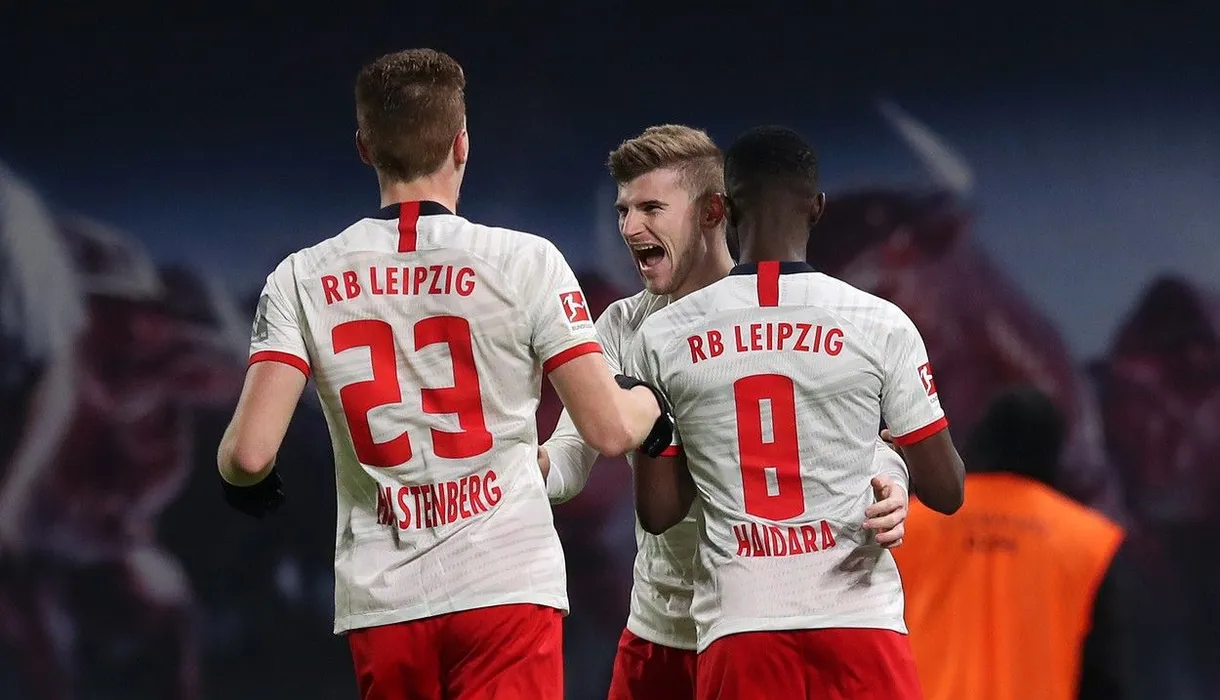 Leipzig's German forward Timo Werner (C) celebrates with Leipzig's German defender Marcel Halstenberg (L) and Leipzig's Malian midfielder Amadou Haidara (R) after scoring the 3-1 during the German first division Bundesliga football match RB Leipzig v FC Union Berlin in Leipzig, on January 18, 2020., Image: 493475394, License: Rights-managed, Restrictions: DFL REGULATIONS PROHIBIT ANY USE OF PHOTOGRAPHS AS IMAGE SEQUENCES AND/OR QUASI-VIDEO, Model Release: no, Credit line: Ronny Hartmann / AFP / Profimedia