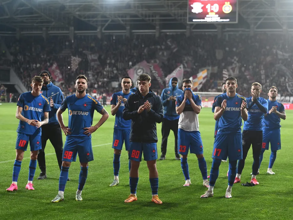 Fotbalistii stelisti Octavian George Popescu, Andrea Compagno, Andrei Ioan Cordea, Adrian Gheorghe Sut,Eduard Gabriel Radaslavescu, Risto Radunovic,Deian Cristian Sorescu si Iulian Lucian Cristea saluta galeria dupa meciul de fotbal dintre Rapid Bucuresti si FCSB, contand pentru Play-off-ul Superligii Superbet, desfasurat pe Stadionul Rapid Giulesti din Bucuresti, duminica 23 aprilie 2023. © FOTO:Razvan Pasarica/SPORT PICTURES