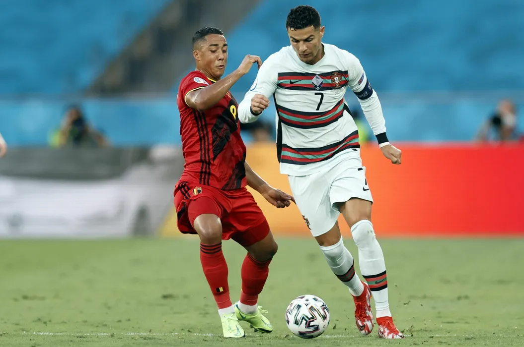 27 June 2021, Spain, Seville: Belgium's Youri Tielemans (L) and Portugal's Cristiano Ronaldo fight for the ball during the UEFA EURO 2020 round of 16 soccer match between Belgium and Portugal at La Cartuja Stadium. Photo: Bruno Fahy/BELGA/dpa