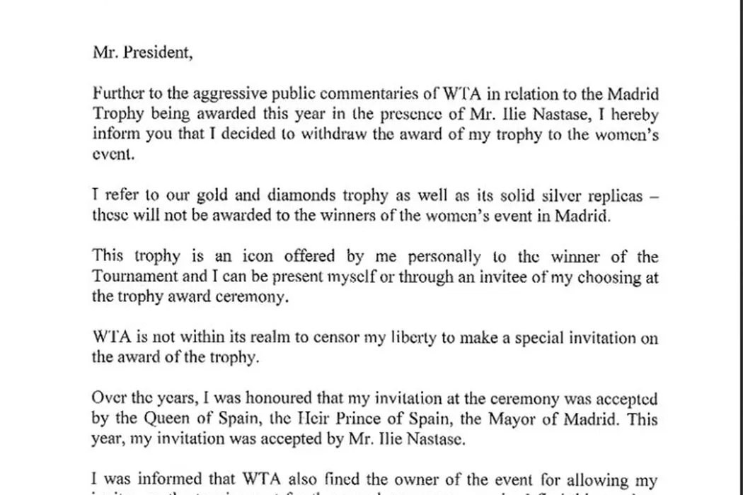 BREAKING NEWS | Decizie radicală luată de Ion Țiriac: suspendă acordarea trofeului Madrid Open! Hotărârea vine ca urmare a reacției WTA în cazul „Năstase”