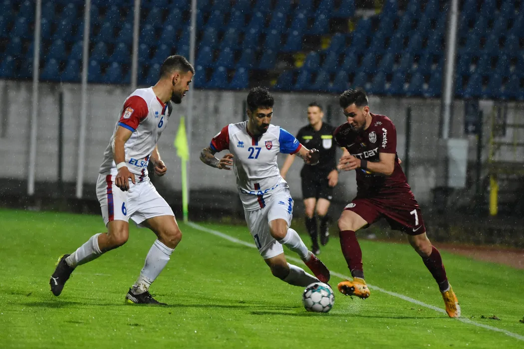 Alexandru Paun (C), de la CFR Cluj, lupta pentru balon cu Eduard Florescu(C) si Andrei Chindris (S), de la FC Botosani, in meciul de fotbal din etapa 9 a play-off-ului Ligii 1, disputat pe stadionul Municipal din Botosani, marti, 18 mai 2021. DRAGOS PASCANEANU/ MEDIAFAX FOTO