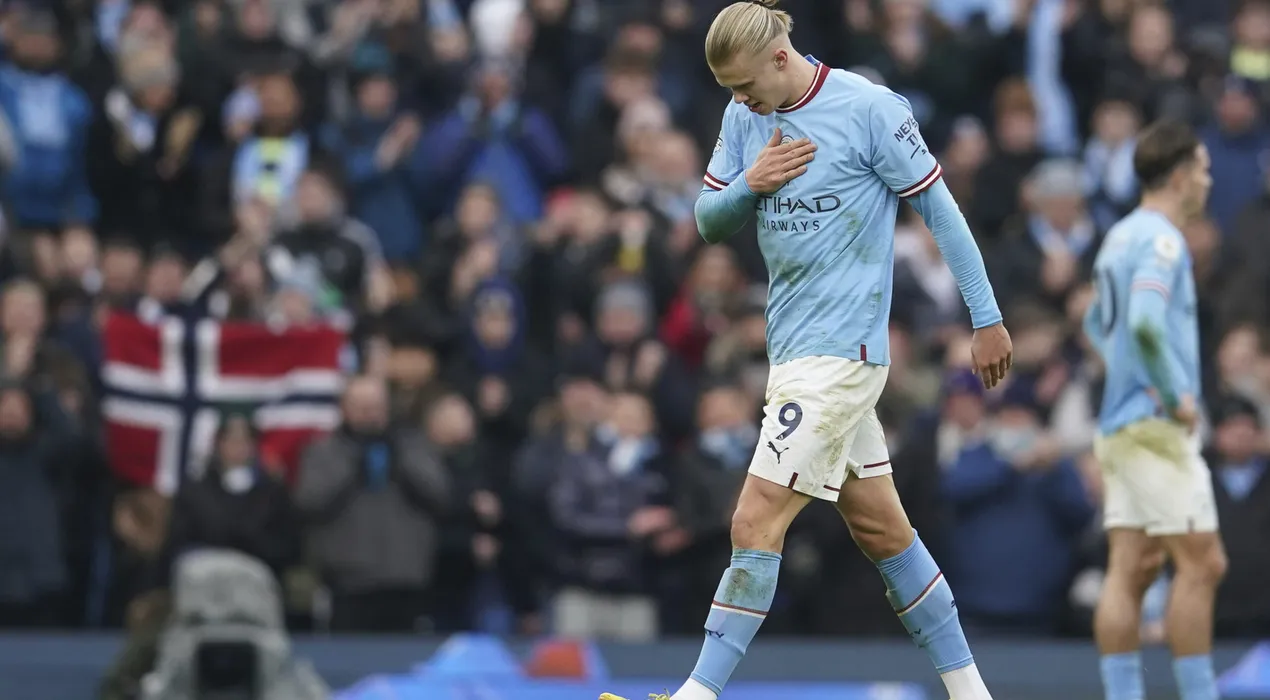 Manchester City's Erling Haaland goes off the field as he is substituted during the English Premier League soccer match between Manchester City and Wolverhampton at the Etihad Stadium in Manchester, England, Sunday, Jan. 22, 2023. (AP Photo/Dave Thompson)