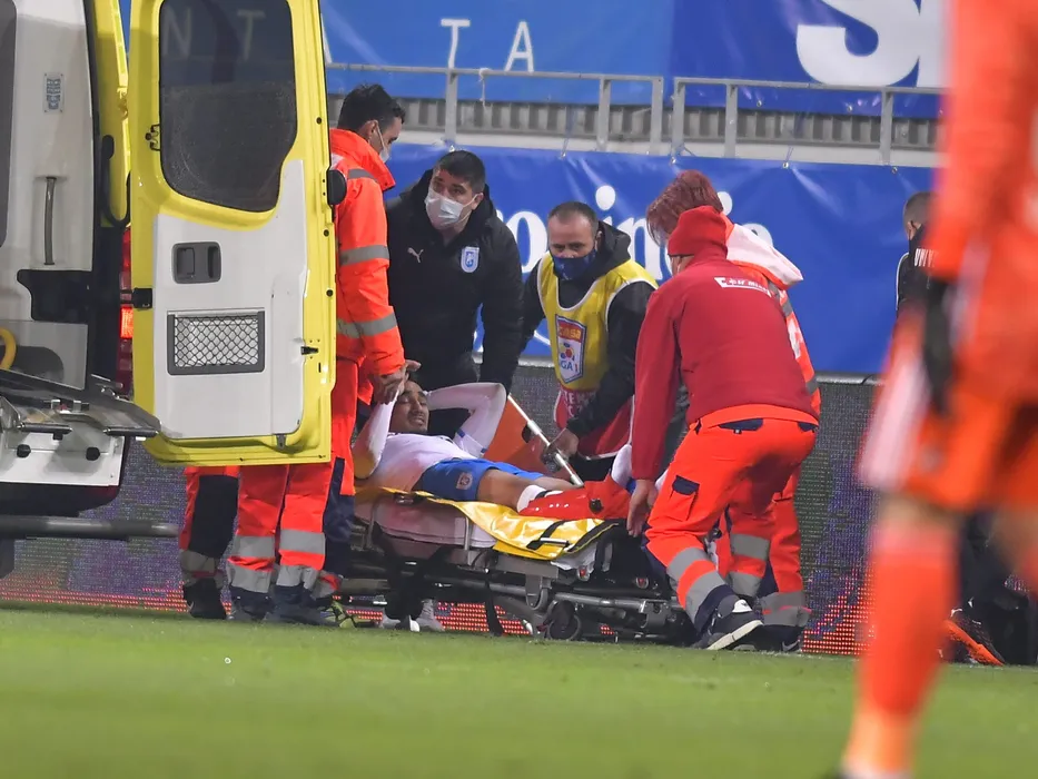 Stefan Baiaram paraseste terenul pe targa accidentat in meciul de fotbal dintre Universitatea Craiova si Sepsi OSK Sfantu Gheorghe, contand pentru Play-off-ul Ligii 1 Casa Pariurilor, desfasurat fara spectatori pe Stadionul Ion Oblemenco din Craiova, sambata 17 aprilie 2021. © FOTO:Razvan Pasarica/SPORT PICTURES