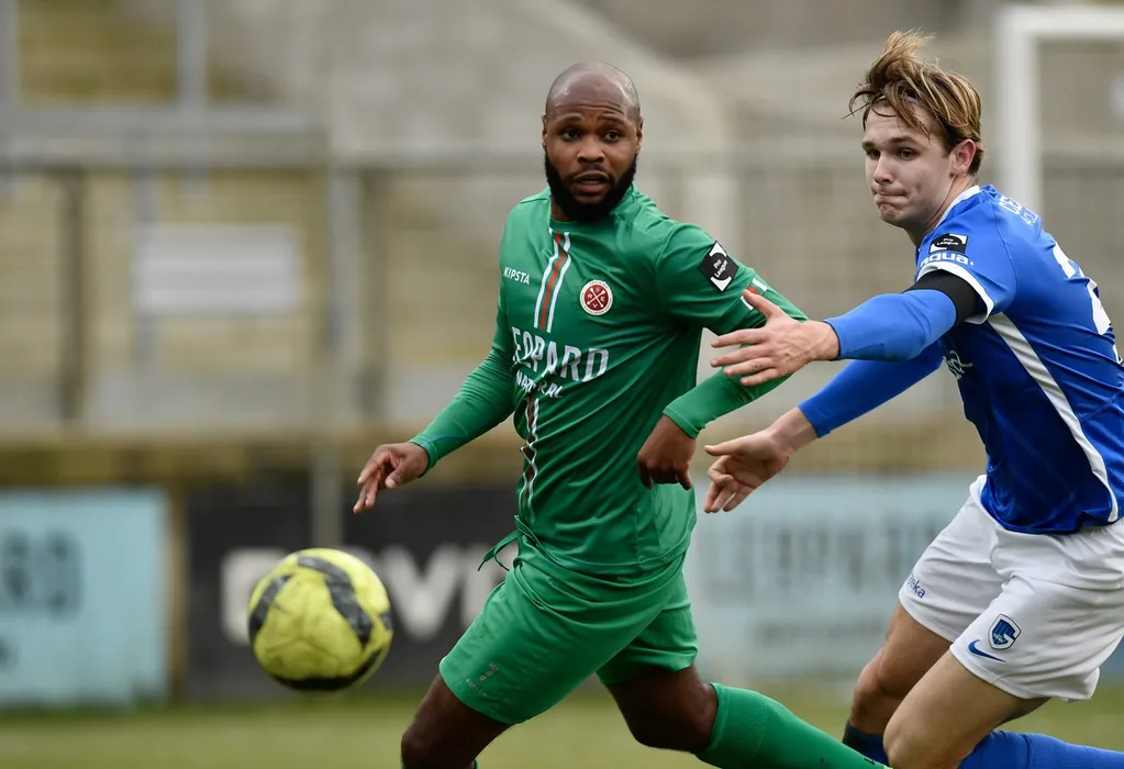 February 12, 2023, VIRTON, BELGIUM: Virton's Hakim Abdallah Djamel and Jong Genk's Matisse Didden fight for the ball during a soccer match between RE Virton and Jong Genk, Sunday 12 February 2023 in Virton, on day 22 of the 2022-2023 'Challenger Pro League' 1B second division of the Belgian championship.,Image: 755565989, License: Rights-managed, Restrictions: * Belgium, France, Germany, Luxembourg and Netherlands Rights OUT *, Model Release: no