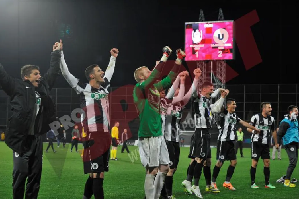 Bucurie imensă pentru fanii lui „U” după victoria cu rivala CFR. FOTO: Ultrașii au intrat pe teren și i-au îmbrățișat pe jucători
