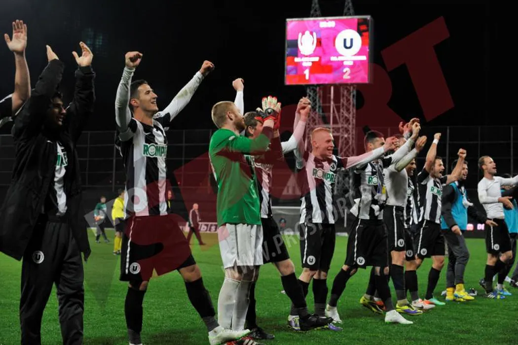 Bucurie imensă pentru fanii lui „U” după victoria cu rivala CFR. FOTO: Ultrașii au intrat pe teren și i-au îmbrățișat pe jucători