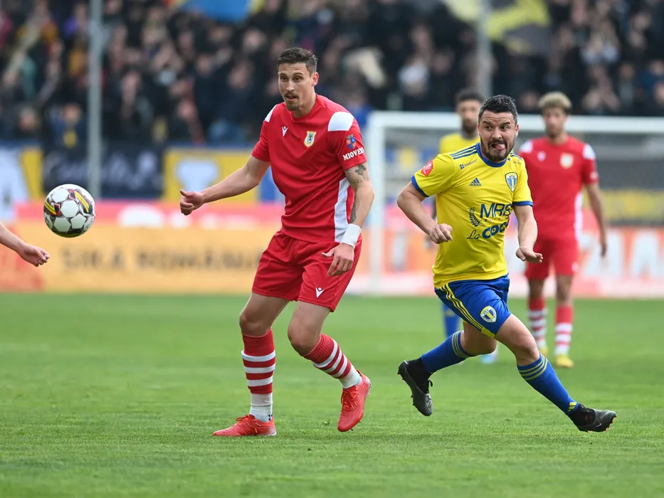 Guilherme Gomes Garutti si Constantin Valentin Budescu in meciul de fotbal dintre Petrolul Ploiesti si CS Mioveni, contand pentru Play-out-ul Superligii Superbet, desfasurat pe Stadionul Ilie Oana din Ploiesti, luni 10 aprilie 2023. © FOTO:Razvan Pasarica/SPORT PICTURES