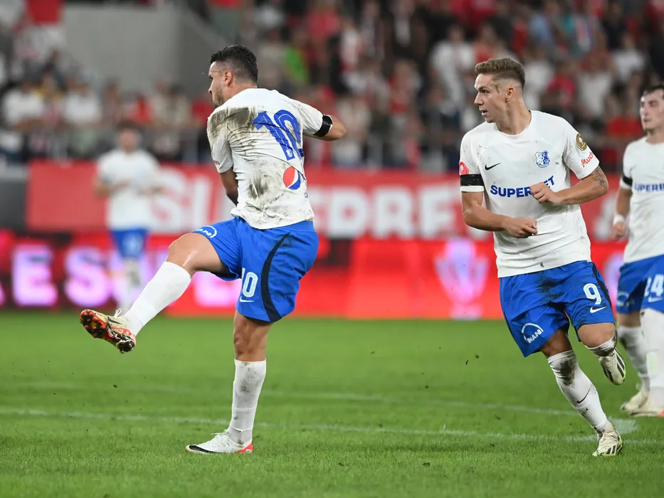Constantin Valentin Budescu marcheaza un gol sub privirile lui Louis Munteanu in meciul de fotbal dintre Dinamo Bucuresti si Farul Constanta, din cadrul Superligii Superbet, desfasurat pe Stadionul National Arcul de Triumf din Bucuresti, vineri 22 septembrie 2023. © FOTO:Razvan Pasarica/SPORT PICTURES