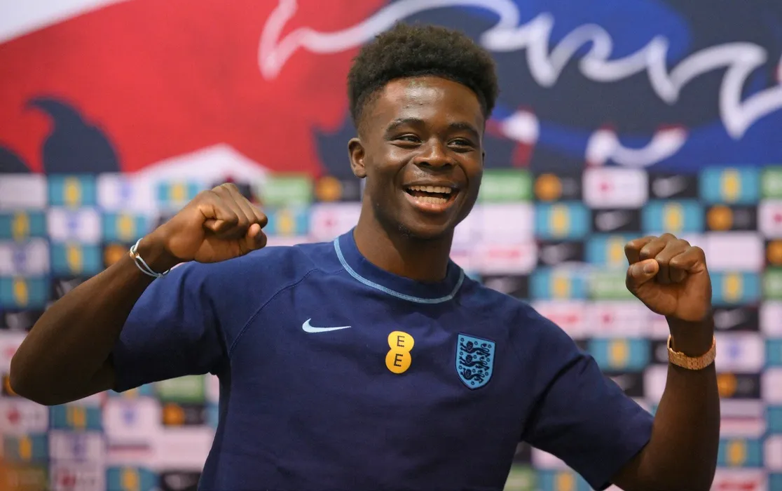 England’s Bukayo Saka takes part in a darts competition against a journalist at Al Wakrah SC Stadium in Al Wakrah, south of Doha on December 5, 2022 during the Qatar 2022 World Cup football tournament.,Image: 742429696, License: Rights-managed, Restrictions: , Model Release: no