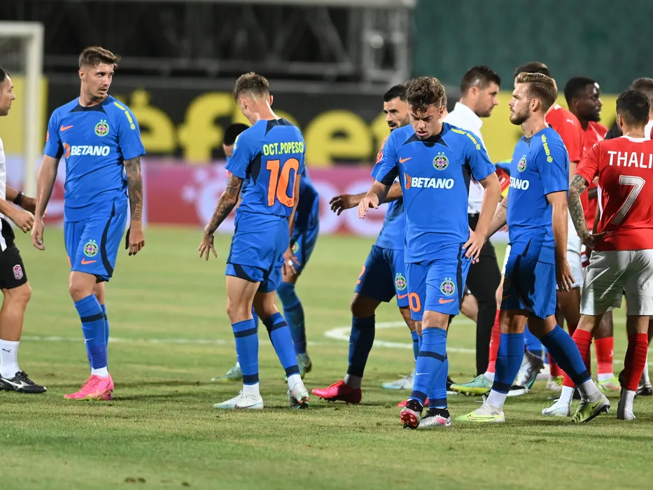 Fotbalistii stelisti David Raul Miculescu, Eduard Gabriel Radaslavescu si Denis Gratian Harut se bucura dupa meciul de fotbal dintre TSKA 1948 Sofia si FCSB, din cadrul UEFA Europa Conference League, desfasurat pe Stadionul National Vasil Levski din Sofia, miercuri 26 iulie 2023. © FOTO:Razvan Pasarica/SPORT PICTURES